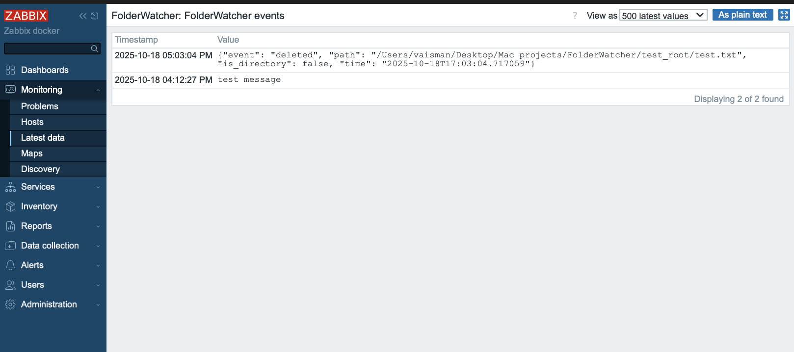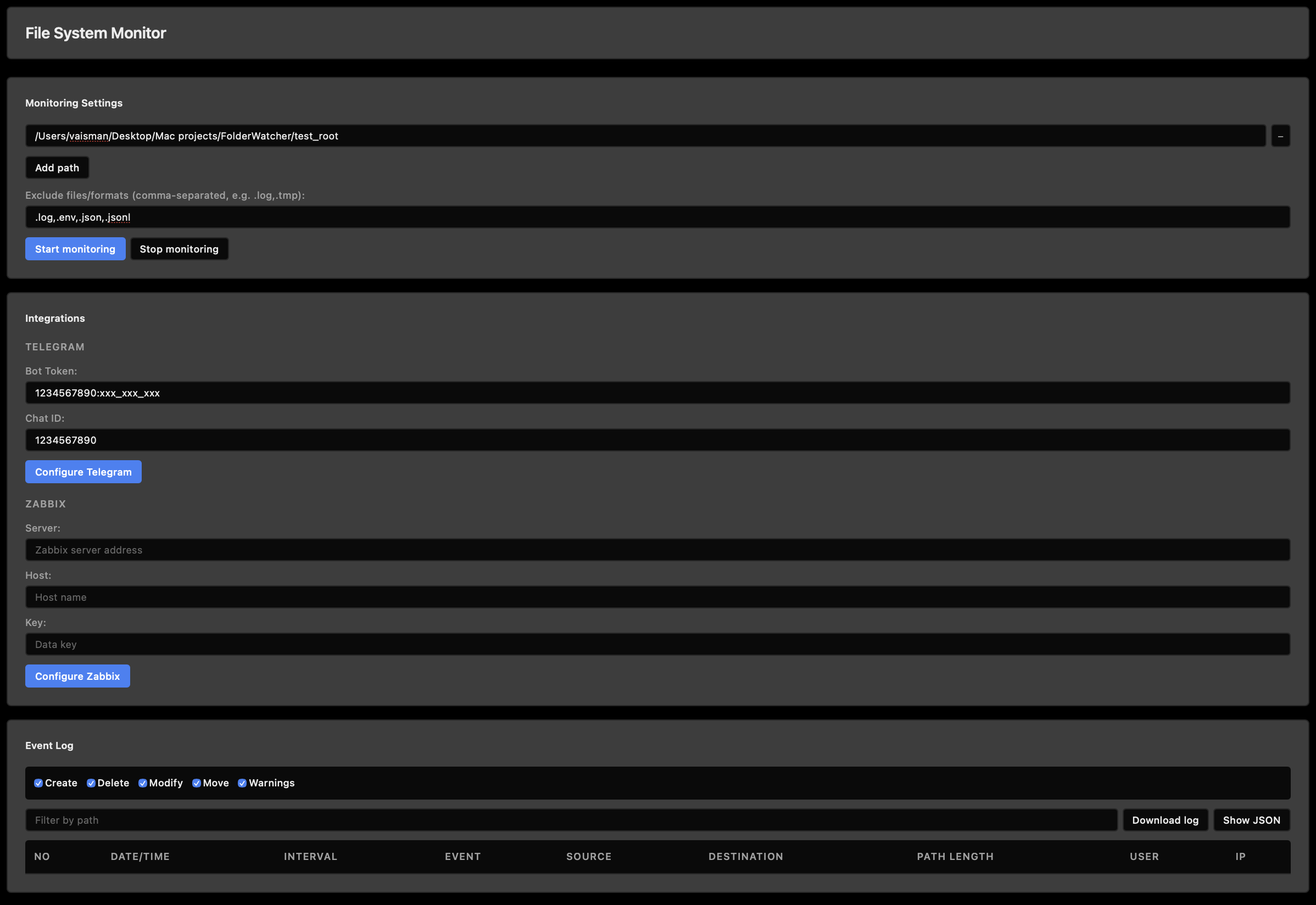 - FastAPI – a minimalist and fast server in Python. It handles HTTP requests from the frontend: starting monitoring, retrieving events, configuring Telegram and Zabbix. This ensures the project is cross-platform: the same code works on macOS, Windows and Linux. You do not need to build an EXE — just open the browser and see all events live.